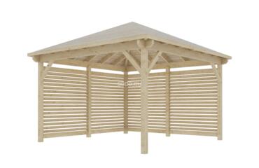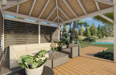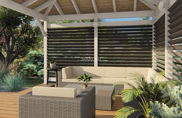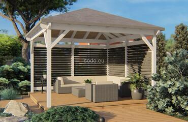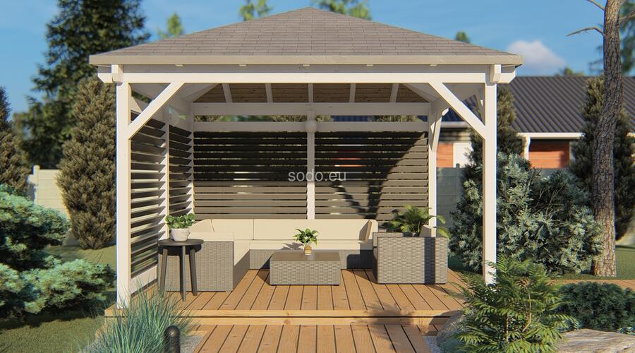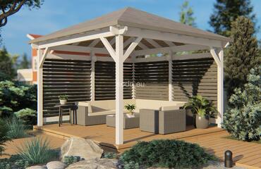 Stylowa pergola z czterospadowym dachem, zapewniająca 22 m² zacienionej powierzchni. Podwyższona linia dachu nadaje każdej przestrzeni zewnętrznej architektoniczny charakter.