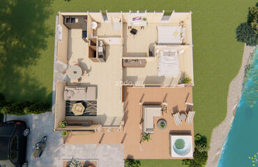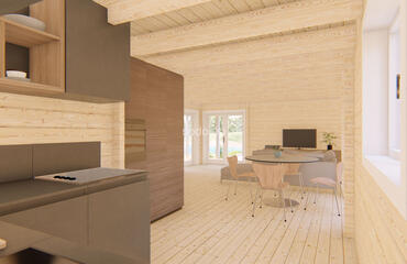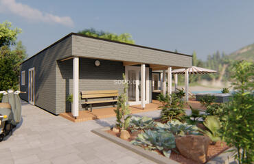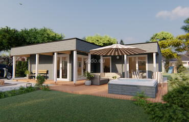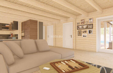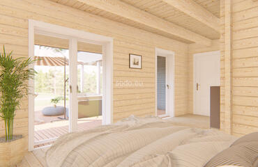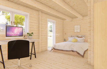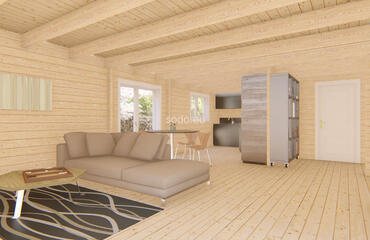 Ta domek w stylu willi ma powierzchnię 74,0 m² i posiada ściany o grubości 58 mm oraz deski podłogowe o grubości 19 mm. Dwuspadowy dach i elegancki wygląd sprawiają, że idealnie nadaje się do zamieszkania przez cały rok.