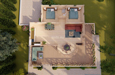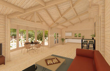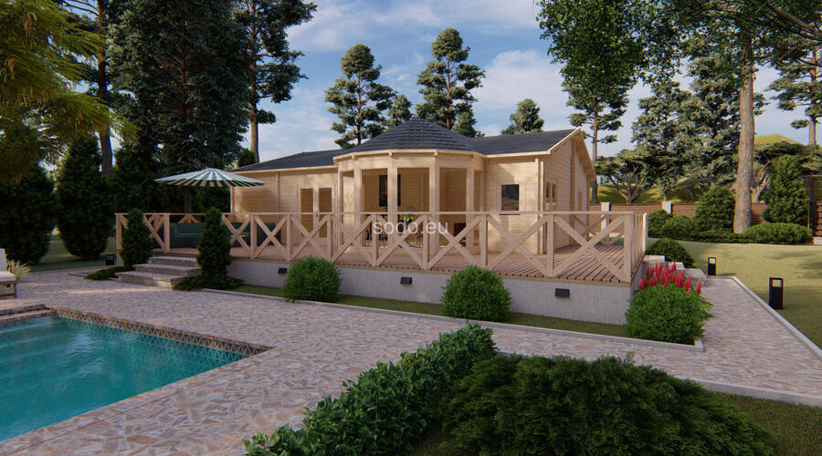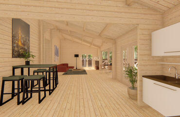 Wiedeń oferuje 103,9 m² powierzchni wewnętrznej z dwuspadowym dachem i ścianami drewnianymi o grubości 58 mm. Składa się z 4 pokoi i ma podłogę z desek o grubości 19 mm, co zapewnia czysty i elegancki układ.