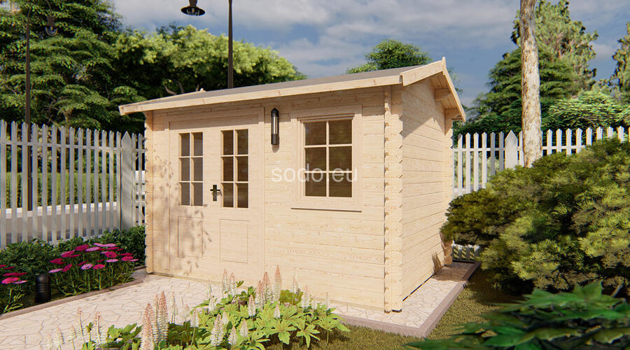 Erna apresenta um telhado de duas águas e paredes de 28 mm, com 7,1 m² de espaço interno. As tábuas do piso de 19 mm e a área compacta tornam-na ideal para um pequeno refúgio no jardim.