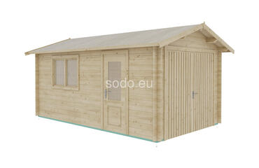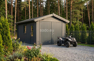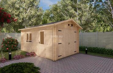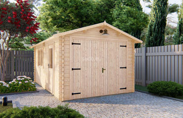 Uma garagem compacta com telhado de duas águas e paredes com 44 mm de espessura, oferecendo 14,3 m² de espaço interno. Ideal para guardar um único veículo, com um acabamento limpo e duradouro.