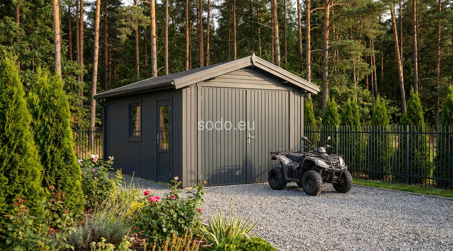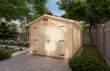 Uma garagem compacta com telhado de duas águas, paredes de 28 mm e tábuas de piso de 19 mm. Inclui 1 divisão e oferece 19,9 m² de cobertura de telhado — perfeita para abrigar um único veículo. Camião completo - 20 unidades. Dimensões da embalagem - (500 x 5400 x 1200)
