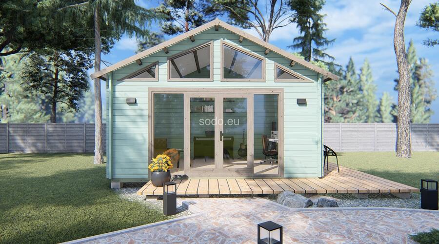 Esta cabana com telhado de duas águas tem 15,1 m² e paredes de 44 mm e tábuas de piso de 19 mm. Com portas totalmente envidraçadas e um interior luminoso, é ideal para um estúdio ou espaço de trabalho.