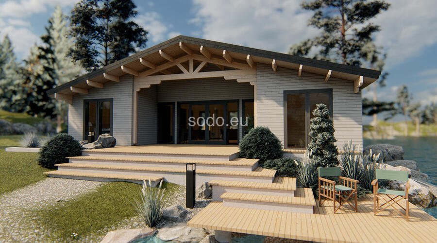 Uma casa espaçosa com 114,9 m² de área interna, construída com madeira de 68 mm e telhado de duas águas. Inclui 4 quartos e tábuas de 28 mm no piso, ideal para uma sala de estar em plano aberto.
