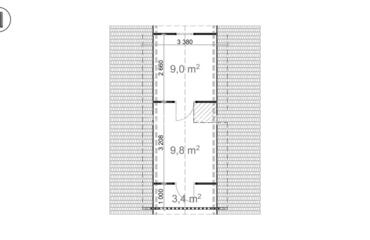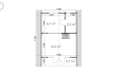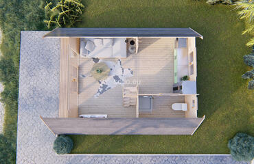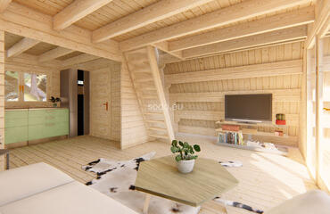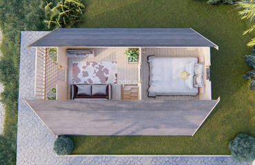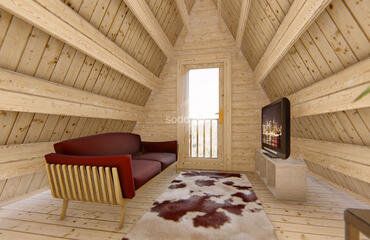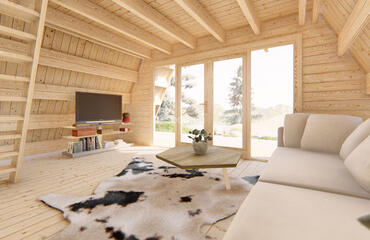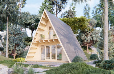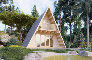 Alce com estrutura em A com paredes de 44 mm de espessura e tábuas de 19 mm no piso. Inclui 3 quartos e oferece 62,3 m² de espaço interno, combinando estética moderna com funcionalidade aconchegante.