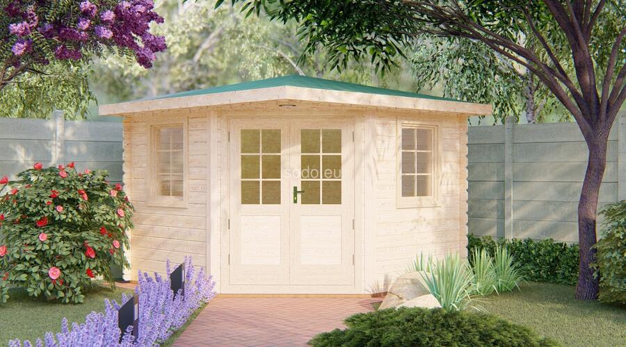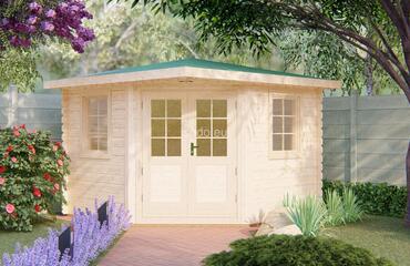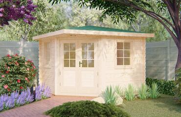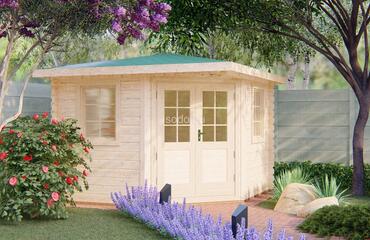 Esta cabana Elyra de tamanho médio tem 8,5 m² com telhado de duas águas e paredes de madeira de 28 mm. Inclui tábuas de piso de 19 mm e é adequada para uso como um pequeno escritório, quarto de hóspedes ou espaço criativo.