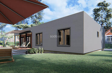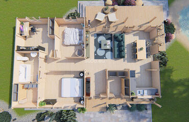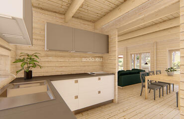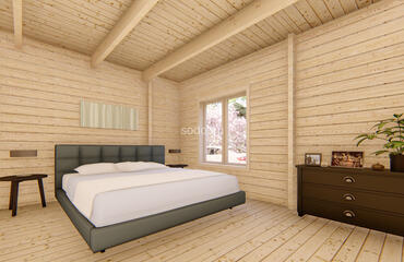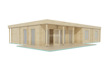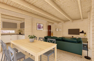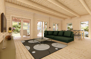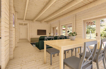 Granada oferece 99,5 m² de área útil distribuída por dois andares, construída com paredes de 58 mm e tábuas de piso de 19 mm. Seu layout é ideal para uma vida luxuosa, com vários cômodos e amplas janelas.
